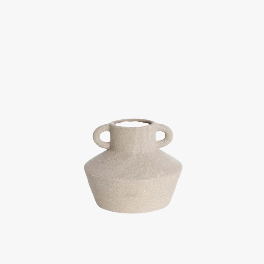 Vas Sandlycka är en charmig liten vas med en skrovlig yta som ger den ett rustikt och personligt uttryck. Den finns i två vackra nyanser– beige och vitt – som enkelt kan kombineras med andra inredningsdetaljer och 2 olika höjder.