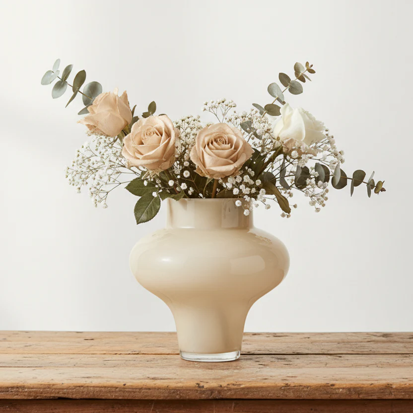 Vas Sphere är en elegant och mångsidig vas i handblåst glas med en varm sandfärg. Den passar lika bra för färska blommor, torkade buketter eller som en stilfull inredningsdetalj utan blommor.