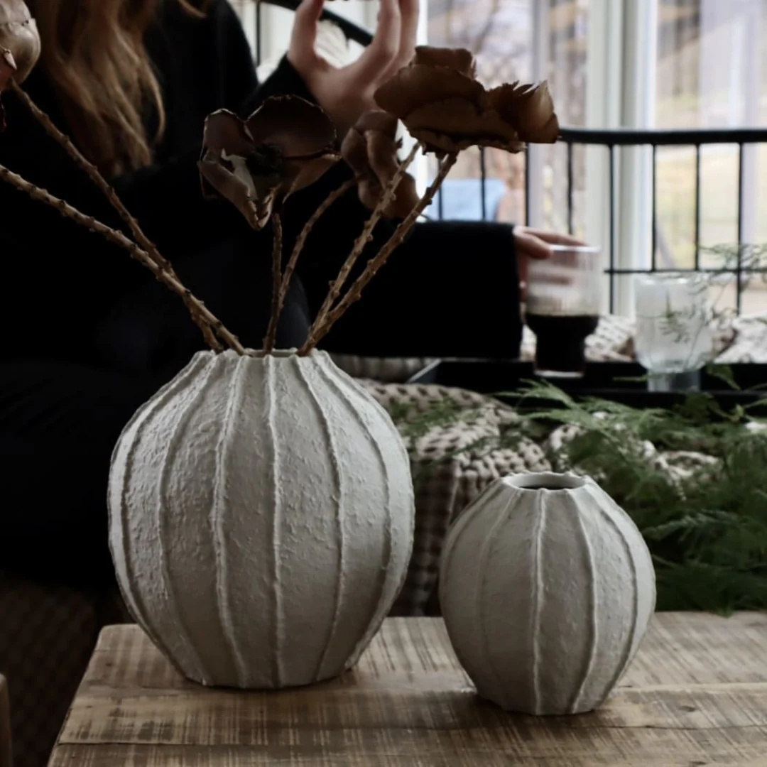 Finns i två storlekar: liten 12×12 cm och stor 18×18 cm. Vasen fungerar lika bra som dekorativ detalj utan innehåll, som en minimalistisk inredningsdetalj, eller med torkade blommor för ett personligt och levande uttryck.